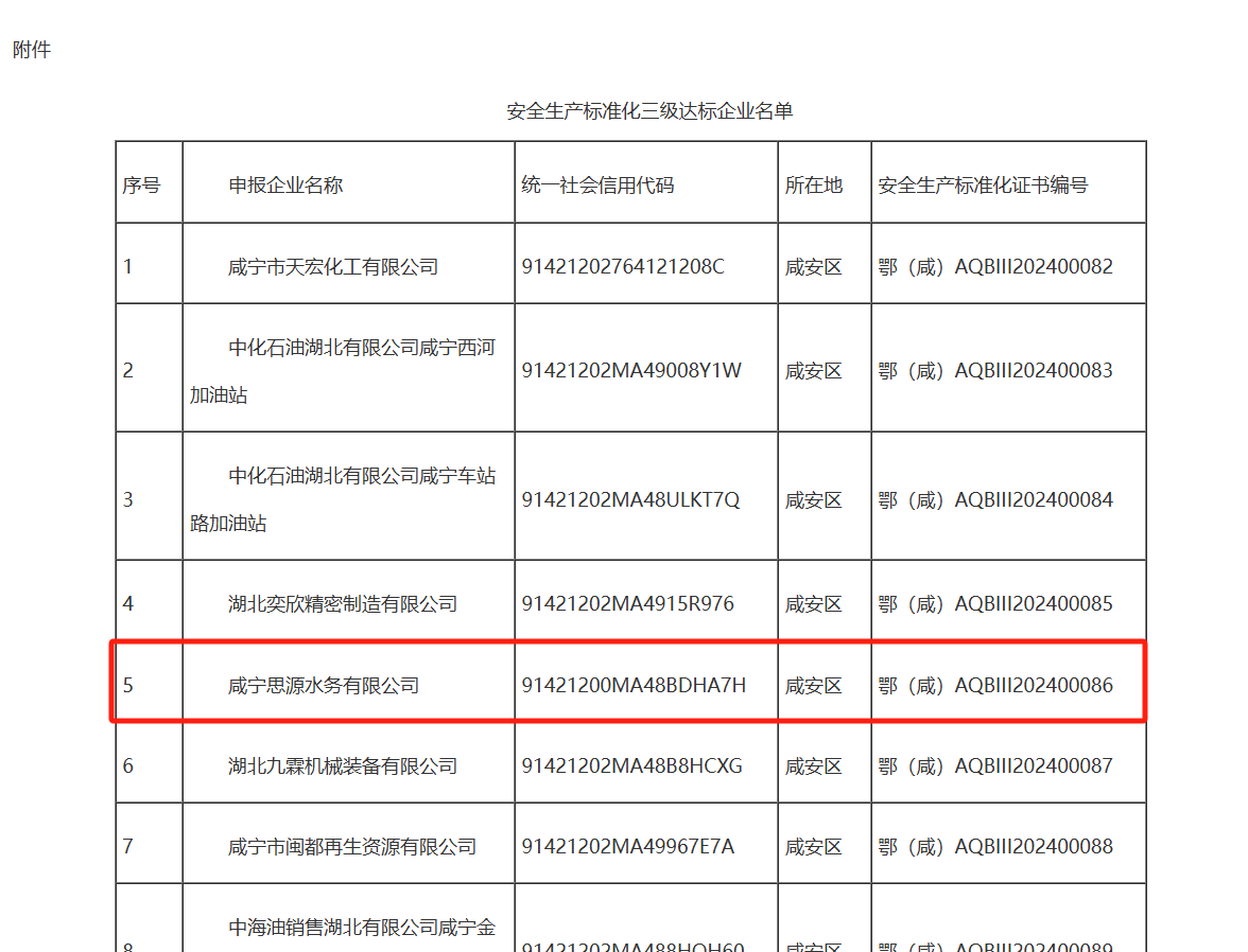 近日,聯(lián)合水務(wù)旗下子公司咸寧思源水務(wù)有限公司順利獲得了由咸寧市應(yīng)急管理局頒發(fā)的“安全生產(chǎn)標(biāo)準(zhǔn)化三級企業(yè)”證書,此項(xiàng)榮譽(yù)的獲得,標(biāo)志著公司安全生產(chǎn)管理工作得到充分肯定。