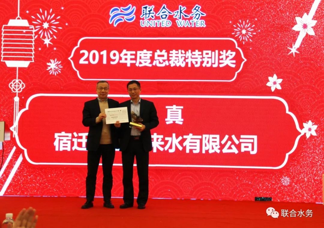 聯(lián)合水務(wù)集團(tuán)董事長(zhǎng)兼總裁俞偉景先生為“總裁特別獎(jiǎng)”獲得者曾真先生頒獎(jiǎng) 2019年是聯(lián)合水務(wù)集團(tuán)極不平凡的一年,各項(xiàng)業(yè)績(jī)突飛猛進(jìn),行業(yè)地位和社會(huì)影響日益突出。在總體經(jīng)濟(jì)形勢(shì)不利的大環(huán)境下,集團(tuán)公司各模塊、北方區(qū)、華中區(qū)、華南區(qū)、海外項(xiàng)目幾大區(qū)域的各項(xiàng)目公司擯除萬(wàn)難、勠力進(jìn)取,均取得了長(zhǎng)足的發(fā)展;集團(tuán)超額完成全年預(yù)算指標(biāo),發(fā)展勢(shì)頭強(qiáng)勁;吐故納新,事業(yè)版圖穩(wěn)步上升,新創(chuàng)建了三個(gè)優(yōu)質(zhì)的項(xiàng)目公司;業(yè)務(wù)領(lǐng)域有了質(zhì)的飛躍,邁出了跨越供水、污水傳統(tǒng)水務(wù)行業(yè)、進(jìn)入水環(huán)境治理全新領(lǐng)域的堅(jiān)實(shí)一步;孟加拉國(guó)首都達(dá)卡市Purbachal新城供水及配水設(shè)施開(kāi)發(fā)PPP項(xiàng)目成功簽約并已開(kāi)啟前期建設(shè),開(kāi)拓海外市場(chǎng)、進(jìn)軍海外首戰(zhàn)告捷,一鳴驚人;上市各項(xiàng)工作穩(wěn)步有序推進(jìn),為明年成功上市打下了堅(jiān)實(shí)基礎(chǔ)。 會(huì)議最后,集團(tuán)董事長(zhǎng)兼總裁俞偉景先生發(fā)表總結(jié)講話(huà)。俞總裁首先肯定了一年來(lái)各區(qū)域、各項(xiàng)目公司的努力和所取得的業(yè)績(jī),感謝全體員工對(duì)集團(tuán)發(fā)展所做出的貢獻(xiàn),希望各項(xiàng)目公司再接再厲、不忘初心、砥礪前行。俞總帶大家回顧2018年年會(huì)所述三大任務(wù):全力增收、全面發(fā)展、A股上市,時(shí)隔兩年,俞總裁向大家亮出了驕人的成績(jī)單。2019年全集團(tuán)營(yíng)業(yè)收入、老舊賬款回收成果顯著;輕重結(jié)合,投資并購(gòu)新項(xiàng)目、進(jìn)入水環(huán)境治理新業(yè)務(wù)領(lǐng)域、開(kāi)拓海外市場(chǎng),公司得到了全面快速發(fā)展;歷年的良好業(yè)績(jī),讓上市工作一路穩(wěn)步推進(jìn),已經(jīng)到了收官階段。全體員工以忠誠(chéng)、努力與執(zhí)行力助力集團(tuán)公司實(shí)現(xiàn)了一個(gè)又一個(gè)發(fā)展目標(biāo)。成績(jī)屬于過(guò)去的輝煌,面對(duì)未來(lái),更要正視不足,持續(xù)改進(jìn)。最后,俞總裁勉勵(lì)大家,2020年是決戰(zhàn)之年,上市不是終極目標(biāo),只是我們發(fā)展過(guò)程中的重要里程碑,只要我們始終踐行“團(tuán)結(jié)誠(chéng)信、拼搏共贏”的企業(yè)發(fā)展理念,我們就一定能實(shí)現(xiàn)我們使聯(lián)合水務(wù)成為一家GREAT(偉大的)水務(wù)公司的夢(mèng)想!