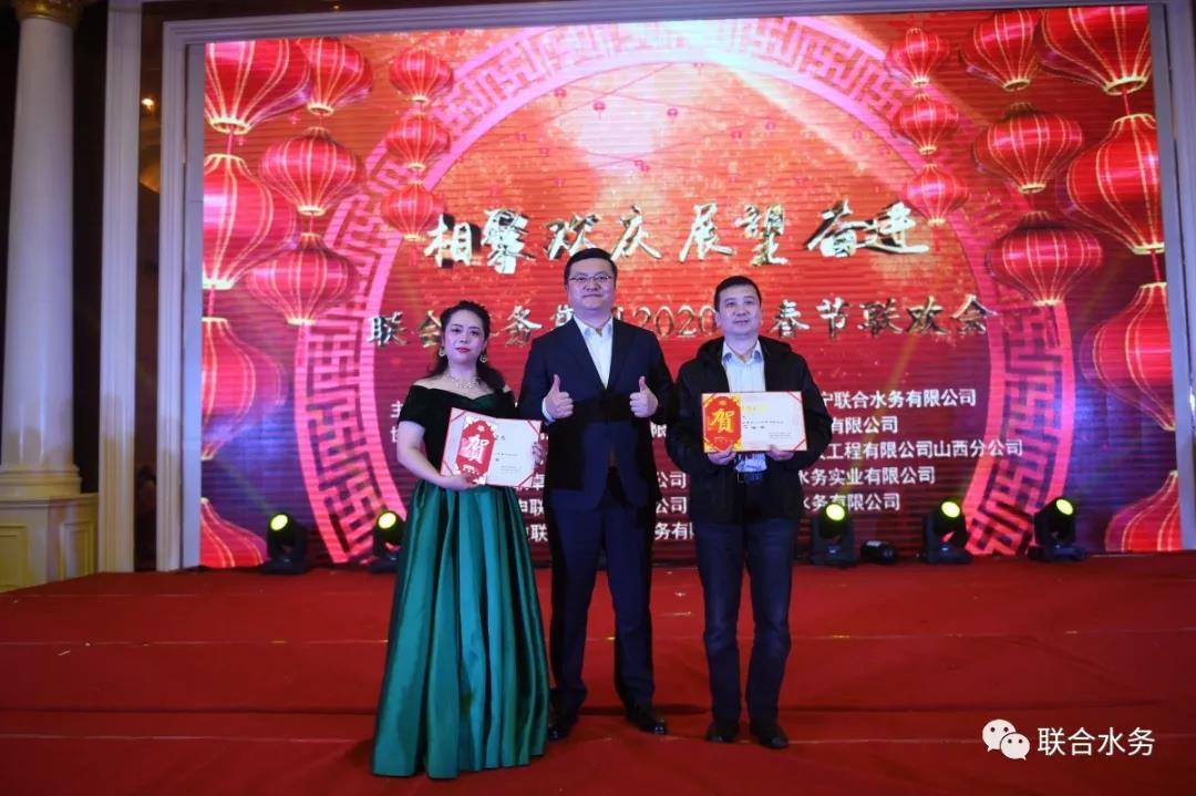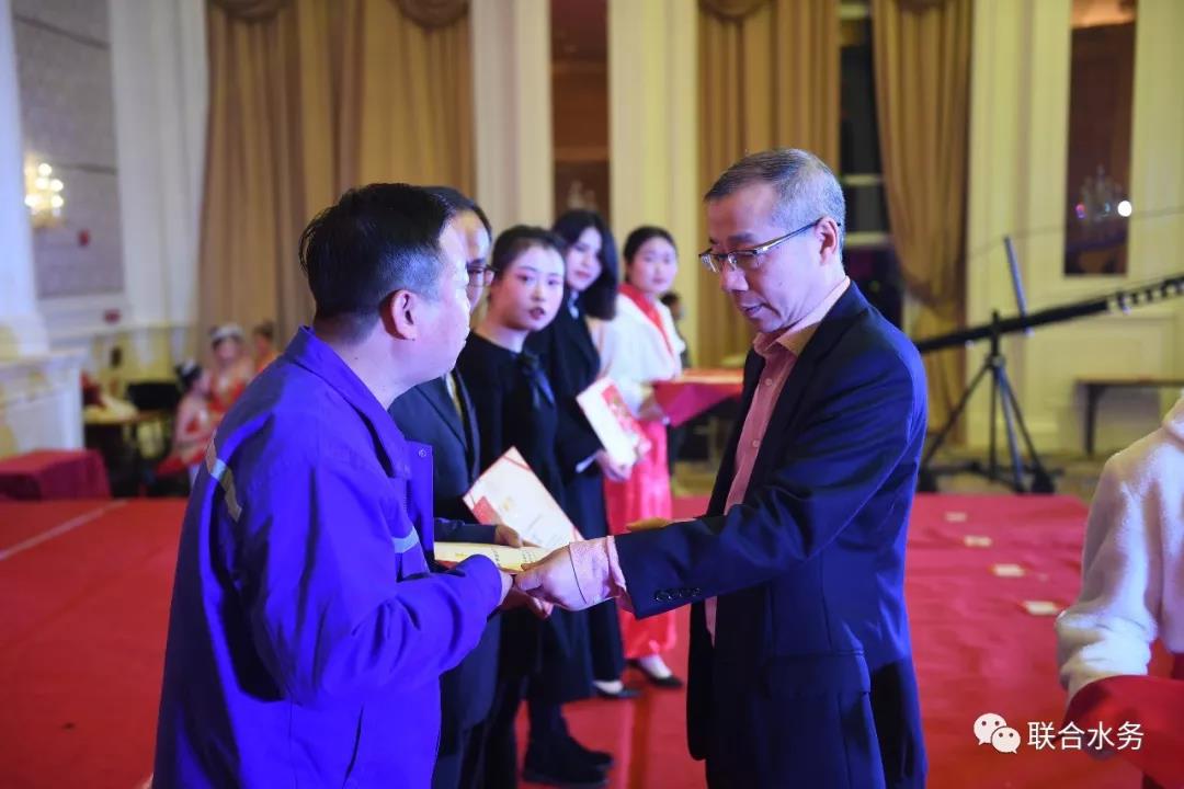 聯(lián)合水務(wù)集團(tuán)董事長(zhǎng)兼總裁俞偉景先生致新春賀辭 俞總的致辭情真意切,振奮人心,另一個(gè)提振士氣的時(shí)刻又將到來(lái)。2019年,全集團(tuán)共產(chǎn)生了37位先進(jìn)員工,他們?cè)诟髯缘膷徫簧献龀隽送怀龅某煽?jī),為彰顯榜樣的力量、鼓舞干勁,聯(lián)歡會(huì)對(duì)先進(jìn)員工們進(jìn)行了現(xiàn)場(chǎng)表彰。他們邁著堅(jiān)定的步伐、帶著自信的微笑,走上臺(tái)上,揮手示意,特邀嘉賓長(zhǎng)江國(guó)控金融控股有限公司董事局主席蘇云先生等、集團(tuán)董事長(zhǎng)兼總裁俞偉景先生等總部各位領(lǐng)導(dǎo)、各項(xiàng)目公司總經(jīng)理上臺(tái)為他們綬紅綢帶、合影留念,并一起給聯(lián)合水務(wù)全體家人拜年,送出了新春祝福。