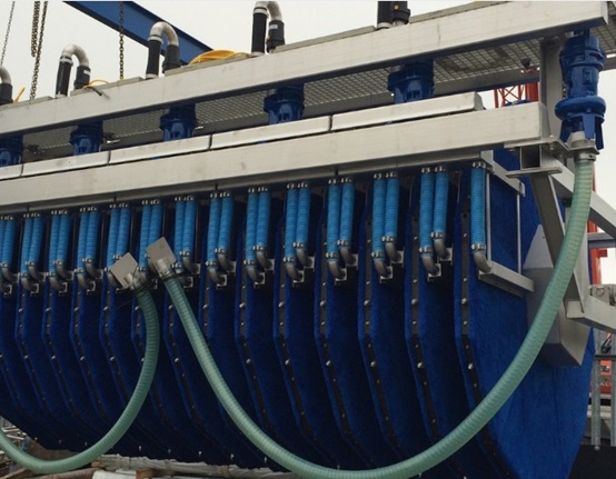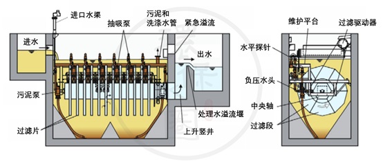 當(dāng)水流經(jīng)濾布進(jìn)入過濾段時(shí),水中的懸浮物被除去,固體留在濾布上。過濾后的水通過中央軸、上升豎井和溢流堰流出裝置。隨著固體顆粒在濾布上的堆積,過濾單元上的液壓阻力增大,從而使濾槽內(nèi)的水位升高。