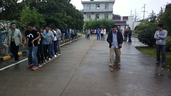 9月30日下午,舉辦的是“無(wú)軌列車(chē)”活動(dòng)。該項(xiàng)團(tuán)體活動(dòng)要求每組4男4女搭配,各組組員的兩腳必須分站在由兩塊木板制成的行走板上,協(xié)調(diào)一致前行,在比賽過(guò)程中任意隊(duì)員任意部位與地面有接觸,即被警告1次,同時(shí)在總成績(jī)上增加10秒,警告3次取消比賽資格。賽道全長(zhǎng)50米,含下坡路段,成績(jī)匯總后,以完成比賽用時(shí)最短的一組獲勝。最終,行政財(cái)務(wù)聯(lián)隊(duì)以1分48秒的成績(jī)獲得第一,工程聯(lián)隊(duì)獲得第二,洋河聯(lián)隊(duì)、污水客服聯(lián)隊(duì)并列第三。