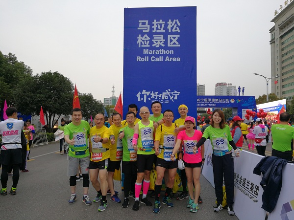 (圖3:微型馬拉松隊(duì)員合影) 集團(tuán)副總裁劉猛先生帶領(lǐng)集團(tuán)46名微型馬拉松隊(duì)員,甩開(kāi)膀子、大步向前沖刺,賽道上大家不甘落后,互相鼓勵(lì),以堅(jiān)韌不拔、永不言棄的精神,超越自我極限,跑向終點(diǎn),咸寧聯(lián)合水務(wù)羅志祥獲得了聯(lián)合水務(wù)微馬參賽人員第一名。 集團(tuán)副總裁陳樵、James Beeson先生帶領(lǐng)17名全程、半程馬拉松隊(duì)員經(jīng)過(guò)1至3個(gè)多小時(shí)的激烈角逐,全部抵達(dá)終點(diǎn)。集團(tuán)人事行政總監(jiān)楊麗霞是唯一跑全馬的女性,她以超人的毅力,鍥而不舍的精神跑完全程。新絳縣晉華生態(tài)環(huán)境工程有限公司總經(jīng)理夏學(xué)春和瑞昌市金達(dá)萊環(huán)保有限公司梅琳分別獲得聯(lián)合水務(wù)參賽人員半程和全程馬拉松第一名。集團(tuán)領(lǐng)導(dǎo)分別為微型、半程和全程馬拉松獲獎(jiǎng)運(yùn)動(dòng)員頒發(fā)了獎(jiǎng)金。