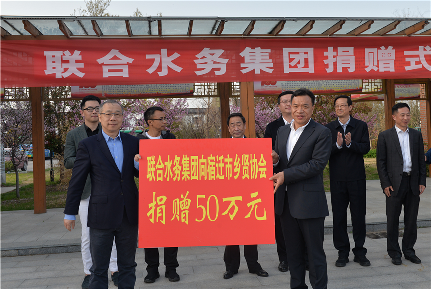 捐贈(zèng)儀式現(xiàn)場(chǎng)合影 3月28日下午,聯(lián)合水務(wù)集團(tuán)董事長(zhǎng)兼總裁俞偉景一行來(lái)宿考察鄉(xiāng)賢義務(wù)護(hù)水工作,并向市鄉(xiāng)賢協(xié)會(huì)捐贈(zèng)人民幣50萬(wàn)元為護(hù)水鄉(xiāng)賢購(gòu)買(mǎi)人身意外傷害保險(xiǎn)。宿遷市政協(xié)副主席、黨組副書(shū)記,市鄉(xiāng)賢協(xié)會(huì)顧問(wèn)華志明及市、區(qū)鄉(xiāng)賢協(xié)會(huì)負(fù)責(zé)人出席捐贈(zèng)儀式,共同見(jiàn)證這一神圣的時(shí)刻。